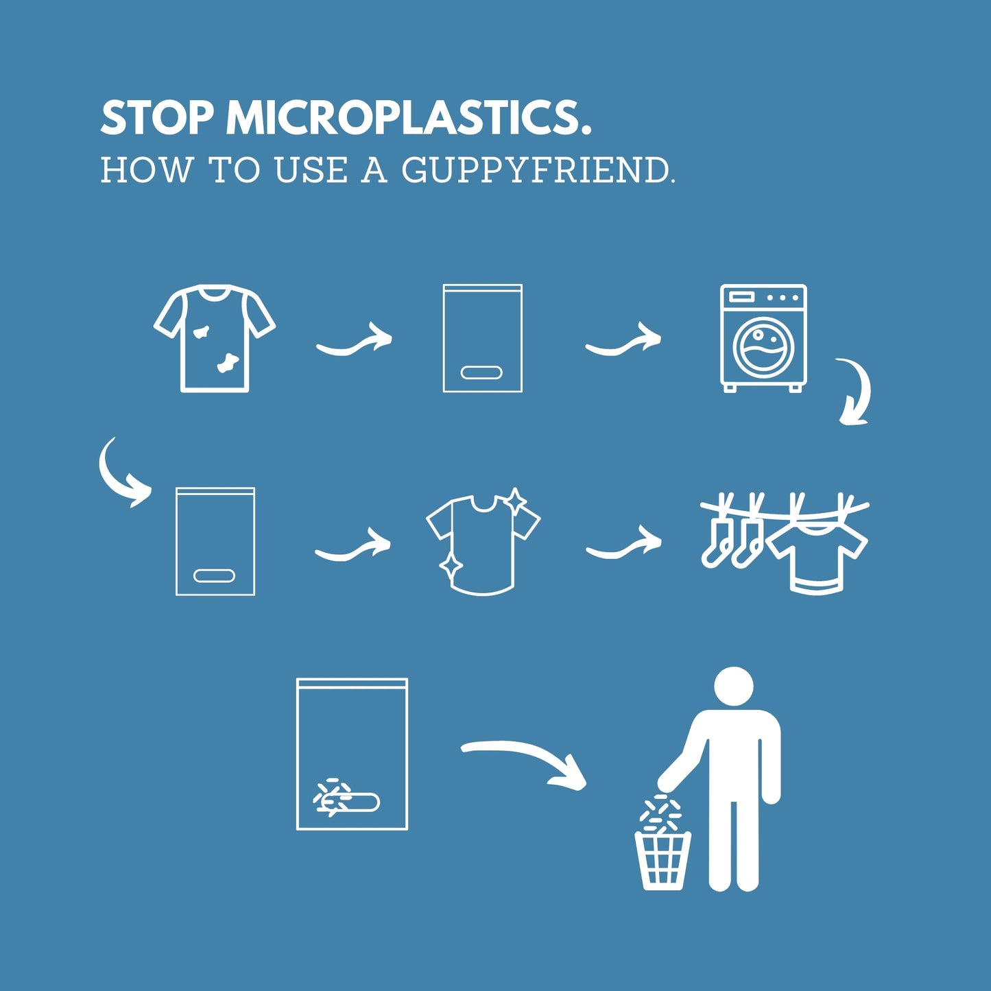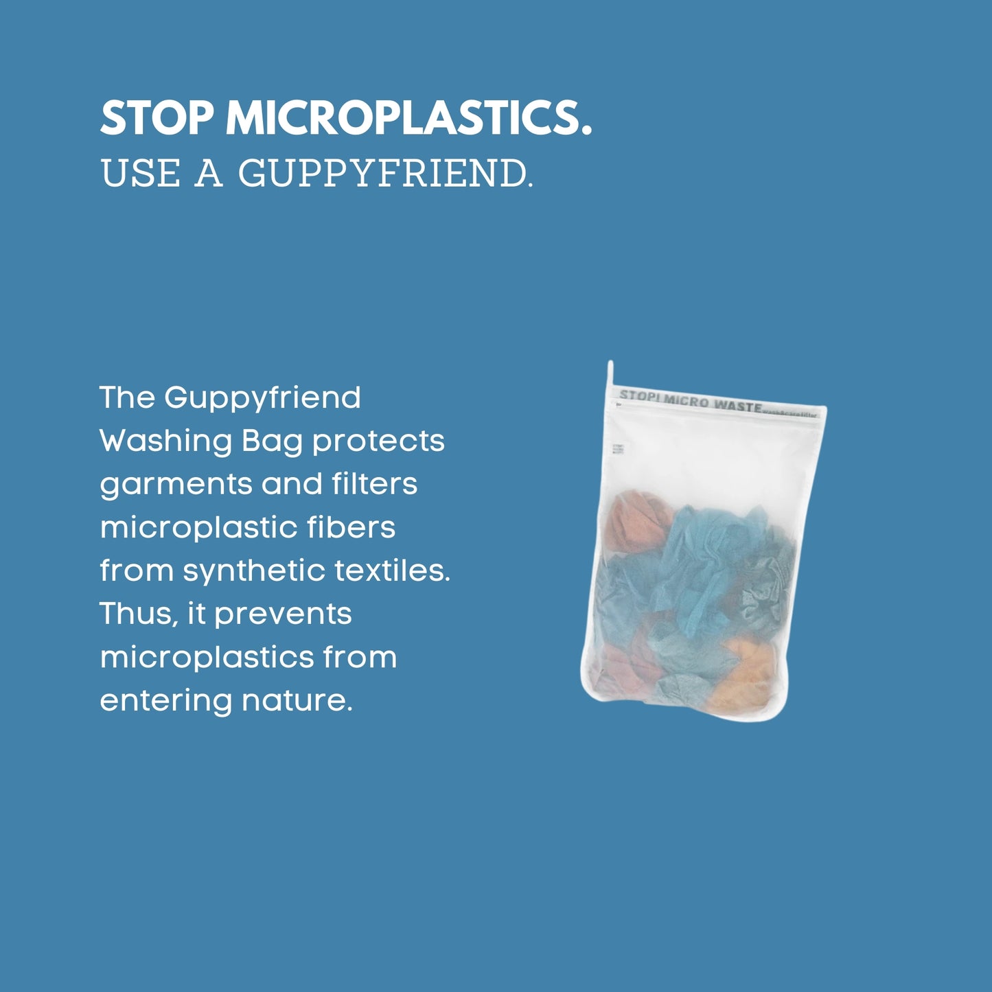 De Guppyfriend waszak is de eerste echte pragmatische oplossing, die voorkomt dat microplastic vezels, door het wassen van synthetisch textiel in rivieren en oceanen terechtkomen. De gebroken vezels verzamelen zich na het wassen in de hoeken van de waszak en kunnen eenvoudig worden verwijderd en veilig weggegooid.